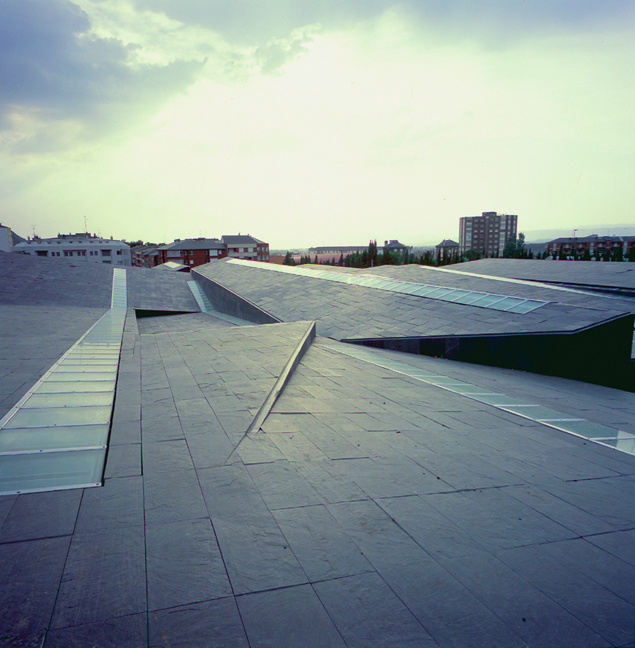 Para ello, el proyecto reconfigura la topografía y se concibe como un complejo tectónico que ampara los tres programas bajo una misma cubierta, plegada, transitable y de gran espesor. Esta gran cubrición, deliberadamente plástica, conforma una sucesión de faldones inclinados de losas de pizarra, dibujados en el lugar recreando imágenes ancestrales de los pueblos negros del Bierzo. La superficie continua de las cubiertas se relaciona con todos los niveles y elementos que concurren en el lugar y configura un espacio fluido de rampas y planos. Los edificios se manifiestan con rotundidad frente a la ciudad, como extrusión expresionista de las cubiertas.