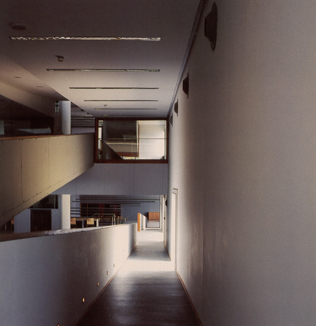 Bajo la zona horizontal de la plaza, la administración. Bajo la inclinada, las salas de lectura y depósitos, dispuestas en plataformas a distintas alturas, comunicadas entre sí por rampas, ascensores y escaleras.