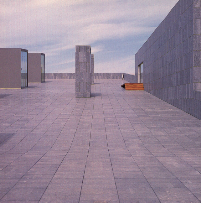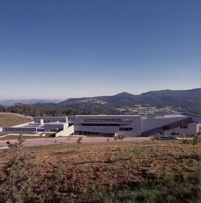 Un gran plano recortado y doblado, en parte inclinado, como cubierta, plaza y puente. Debajo, la biblioteca. Desde la calle de acceso, una escala, la de los pequeños edificios de acceso, ventilación, iluminación, cafetería. Otra, mayor, desde el valle. Hincado en la ladera y del mismo color que los montes de enfrente. Como de una sola pieza, las paredes, los suelos, la cubierta, del mismo material.