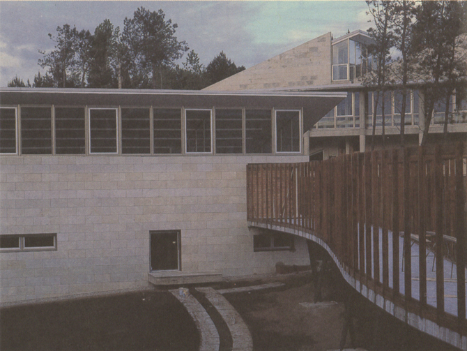 Al final del brazo de aulas, como si fuera su mano, se sitúa el nuevo edificio para la biblioteca. Esta mano se apoya en el terreno, utilizándolo como molde. El plano inclinado de la vaguada nos da la rampa lateral de acceso y una sucesión de plataformas escalonadas en el interior, organizando diversos ámbitos enmarcados por libros, y todos, a su vez, englobados en un espacio común alto.