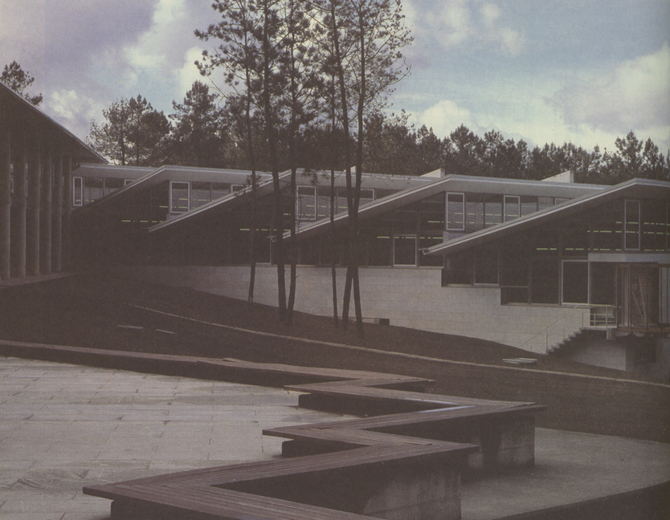 Una sucesión de grandes planos inclinados, a modo de dientes de sierra, captan una vez más la luz natural y, como escondiéndose debajo del ala de aulas, buscan no rebasar las rasantes del corredor principal y plataforma interior, colaborando su posición a cerrar la pradera interior, pero al ir acompañando siempre a la vaguada y a la pendiente interior, no impiden la relación con el paisaje lejano.