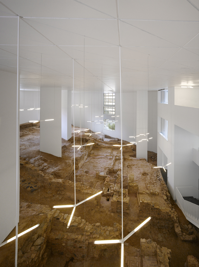 La biblioteca se organiza alrededor del yacimiento arqueológico incorporándolo a su espacio interior en el que grupos de lámparas suspendidas, con geometría triangular, indican la dirección de las antiguas calles, iluminando los restos murarios.