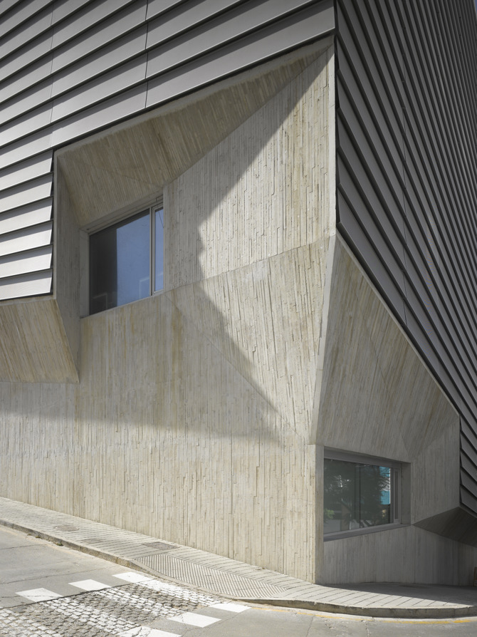 Exteriormente un cerramiento compuesto de dos capas, una de vidrio y una celosía perforada de aluminio, sobre un basamento de hormigón facetado, tamiza como un velo el exceso de soleamiento y de luz, ventila la fachada y atenúa el intenso viento del Estrecho.