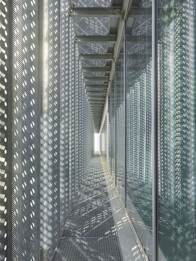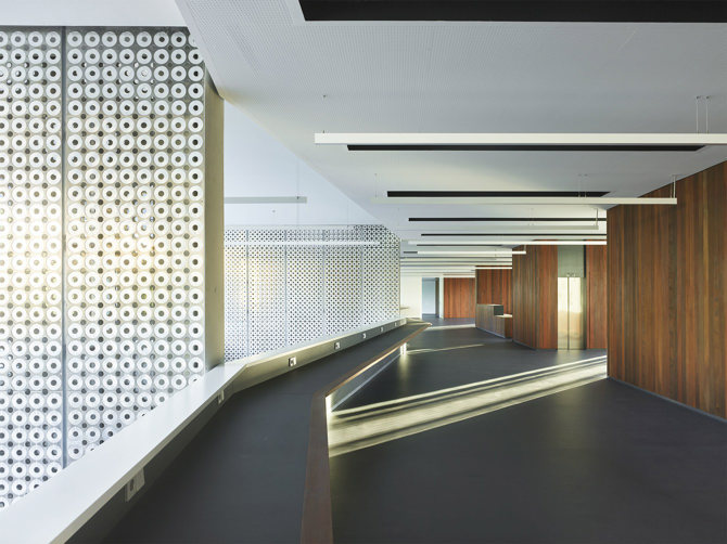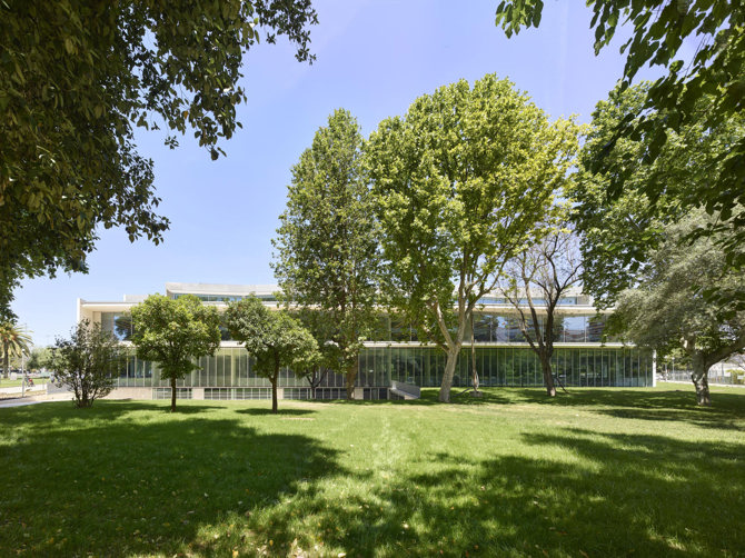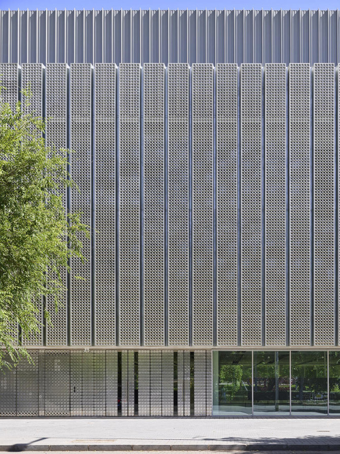 En la cara opuesta al jardín, hacia la avenida, una fachada-celosía continua y precisa construye el límite hacia la ciudad, sirviendo de imagen representativa de la institución. La celosía tridimensional, realizada con piezas modulares de fundición de aluminio, unifica vistas y luces, filtra el ruido del tráfico, y refresca y protege de la orientación poniente; las dos capas de su fachada, inalterable bajo la pátina del tiempo, facilitan su mantenimiento y limpieza. Se interpreta así la celosía tradicional, que permitir ver sin ser visto, así como airear, refrescar y tamizar la luz.