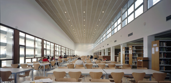 La biblioteca se ha construido en el gran patio de otro edificio universitario en forma de U. En el vestíbulo en la planta baja, situada a nivel de la parte alta del terreno, se llega por una pasarela y por una escalera desde el patio ajardinado, donde queda asentada la planta semisótano. Escalera y rampa identifican, en el conjunto de edificios, al prismático volumen de la biblioteca. Las salas de estudio e informática están localizadas en la planta de acceso y en la planta inferior. La biblioteca está en parte en la planta baja y en la planta superior.