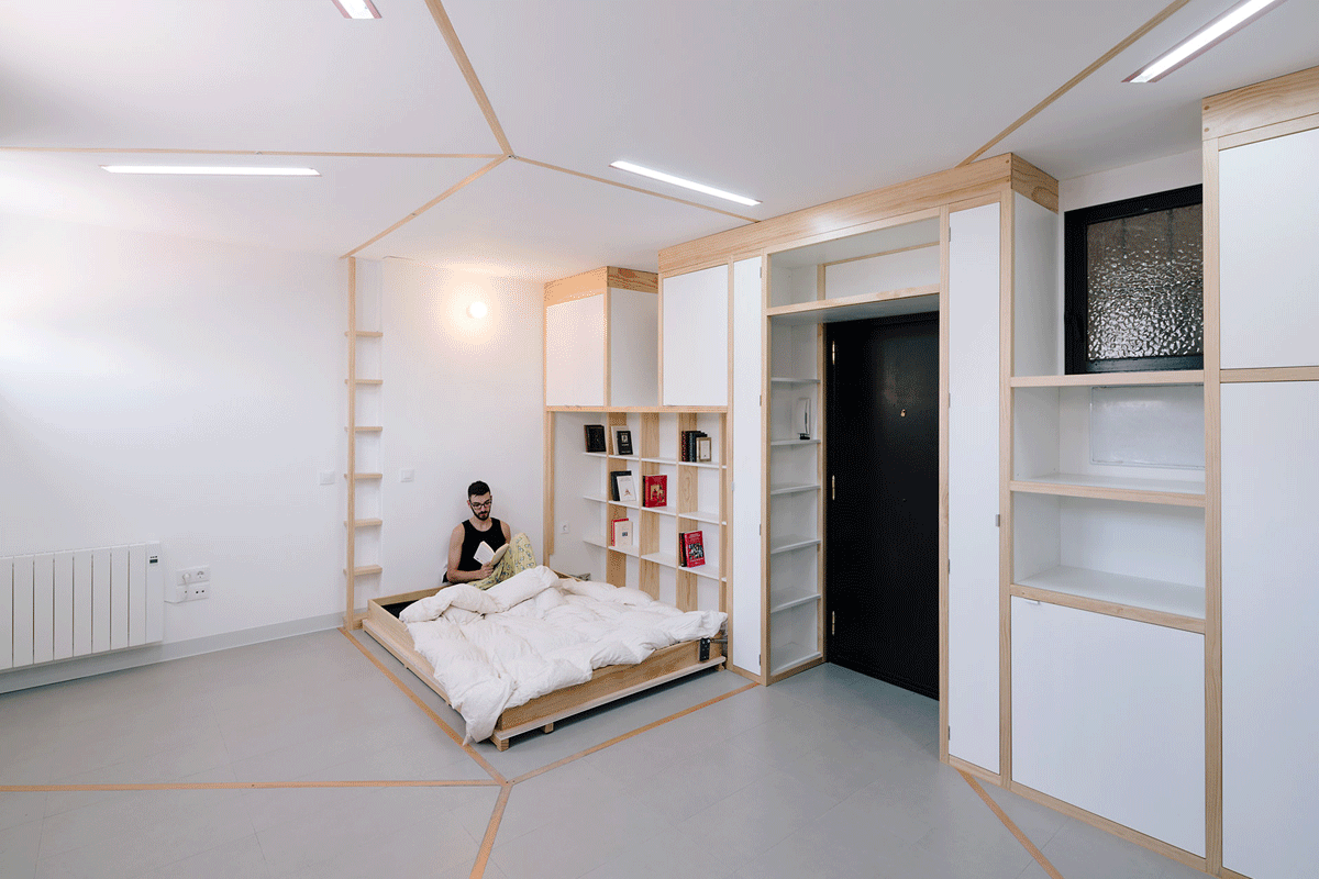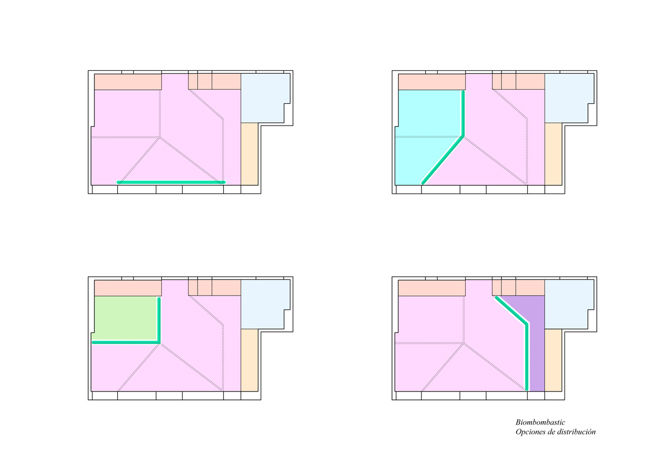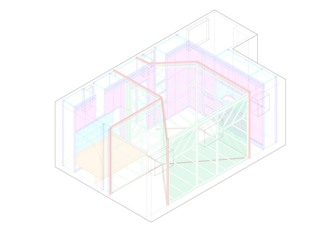 La banda optimiza la distribución del espacio y compacta las funciones para sacar el mayor partido al uso cotidiano del apartamento, adaptándose a la geometría básica del mismo. Por otra parte, un biombo integrado en uno de los laterales se despliega de la pared, conformando diferentes disposiciones domésticas, cerrando el dormitorio, la cocina o dividiendo la casa en dos. Unos carriles de madera articulan el conjunto, resolviendo los puntos de fijación del biombo y marcando la iluminación de los espacios. El biombo, combinado con los dispositivos plegables y abatibles y la iluminación, conforman un espacio flexible que permite alterar las “escenas domésticas” (como si de un “teatro doméstico” se tratase) mediante simples operaciones que hacen que esta casa sea muchas casas en una.