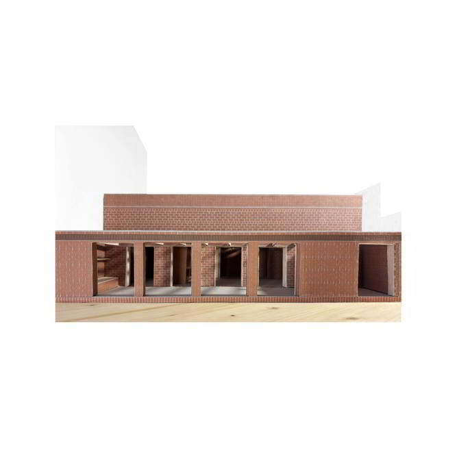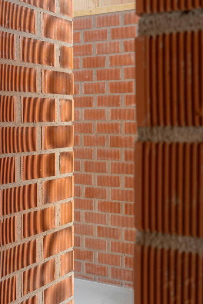 Una vez aprendidas estas cuestiones, el proyecto plantea una aproximación puramente material. Todo lo construido es estructura. Desde la cimentación, hasta la coronación del muro trabajamos con la arcilla como material de construcción. El ladrillo y sus reglas pautan el espacio. El espacio está trabado, construye una arquitectura de límite y umbral. Una arquitectura que se percibe por fragmentos, en discontinuidad. Esta aproximación nos permite utilizar un ladrillo común (ladrillo acústico db10 de cerámica sampedro, en Lardero), y elevar su dignidad como material de construcción. En definitiva, la arquitectura proyectada quiere responder como se habita el interior de la materia arcillosa.
