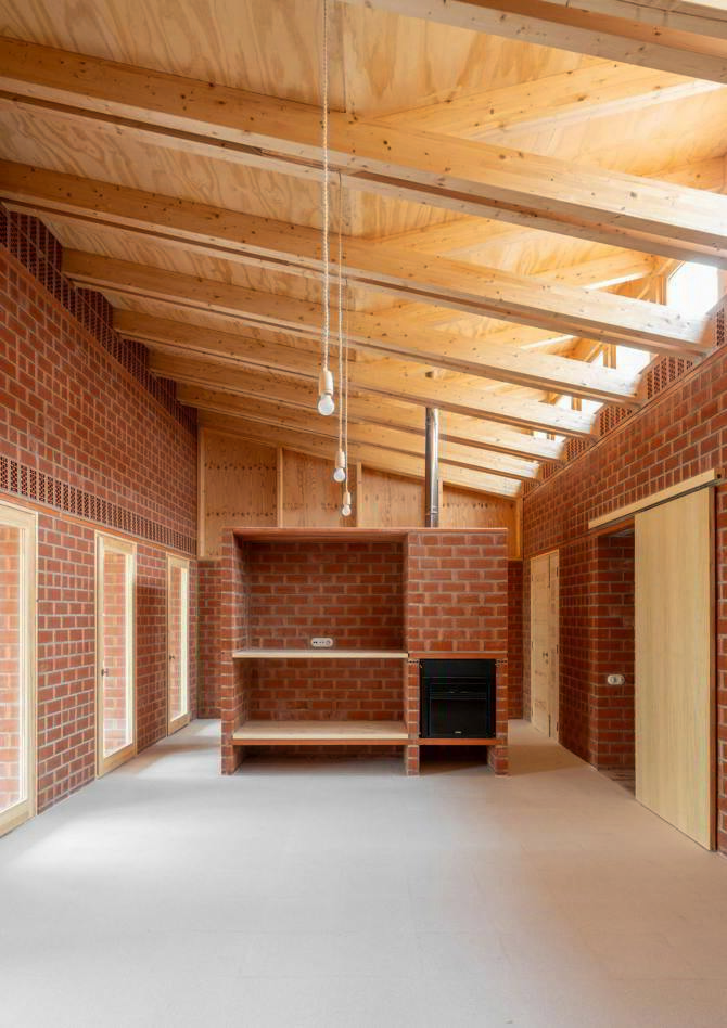 Además, utilizamos todos los recursos a nuestro alcance. Para la configuración de la cubierta, se utiliza madera laminada de pino Soria, en una sección de 10×20 centímetros con tijera intermedia de idéntica dimensión. Esta estructura de cubierta configura una suerte de espacio tramado, estableciendo una entrada de luz desde el oeste en discontinuidad. Por último, los solados utilizan dos materiales producidos en la propia región. Ubicamos ladrillo artesanal de los tejares de Alberite para configurar los umbrales donde se ha eliminado estructura muraria, evidenciando su capacidad portante. Finalmente, se utiliza terrazo, producido en Alfaro que plantea un solado fresco para el largo verano riojano.