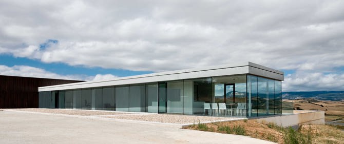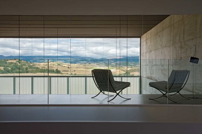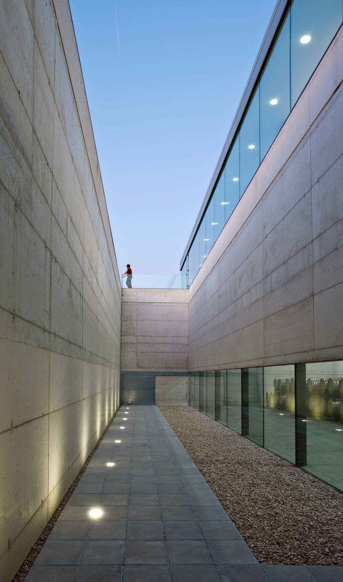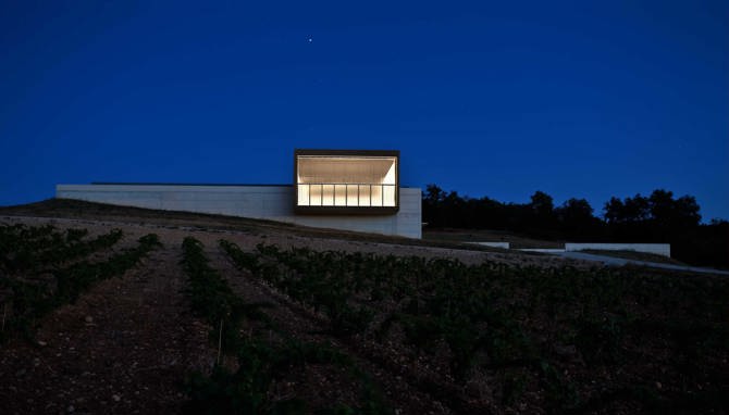 Con esas premisas se concibe un edificio que pretende adaptarse al máximo a las condiciones naturales del terreno, evitando modificaciones artificiales de la topografía existente. Este se concreta en la ordenación de dos volúmenes básicos, uno bajo la rasante del terreno y otro que descansa sobre este. El edificio se plantea con gran rotundidad volumétrica sin renunciar a su voluntad de hito en el paisaje. El aspecto exterior del edificio queda definido por el paralelepípedo de la nave de elaboración que mira al norte a través de un gran lucernario, que por la noche se convierte en una referencia del Camino, como lo eran en otros tiempos las antorchas de las iglesias para atraer a los peregrinos.