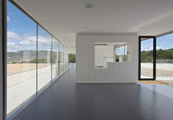 La planta de acceso (nivel 0) acoge el control, la zona administrativa y un área destinada a eventos gastronómicos por parte de los socios, todo ello ubicado en un alargado pabellón de aspecto liviano cuyo cerramiento está formado enteramente de vidrio que dialoga con la superficie pétrea que le antecede y el paisaje. Por uno de sus extremos se accede al volumen principal de la edificación, que en esta planta funciona como vestíbulo de recepción al visitante donde puede gozar de las vistas del valle o bien comenzar su visita a las instalaciones sin perder de vista la perspectiva interior de la nave de elaboración y patio de barricas. El resto de instalaciones se completan con la zona de vendimia, ubicada en el extremo sur de la nave de elaboración y con acceso directo desde el exterior.