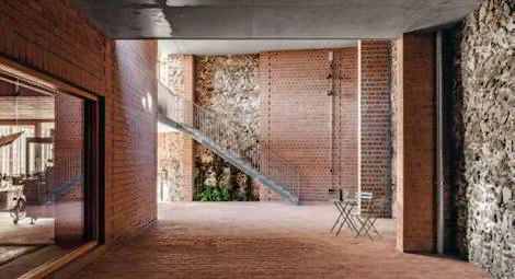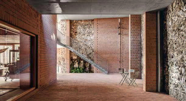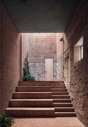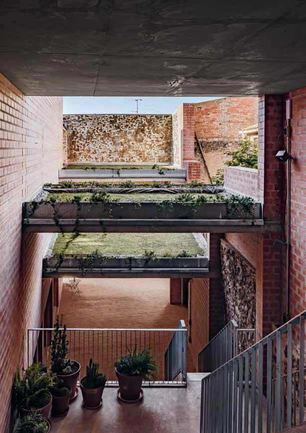 La cubierta actúa como techo refrescante aprovechando la radiación nocturna del cielo para enfriarse mediante un sistema cerrado de recirculación de agua. En planta baja se abren cavidades a modo de “capillas”, que conectan visualmente nave y pasaje. El pasaje es una transición térmica hacia la bodega. Su cubierta es vegetal, almacena la lluvia, refresca el ambiente y evita la radiación solar directa. Las fachadas a la calle se revisten con una capa fina de mortero de cal que ayuda a contextualizar el edificio en el pueblo. La presencia externa es más vernácula, pero al entrar los sistemas constructivos se deconstruyen y muestran la naturaleza del edificio.