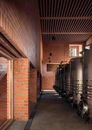 Se crean dos ámbitos: un gran volumen de planta rectangular, la nave, donde se ubica la producción, y el espacio restante en forma de “Z”, el pasaje, una calle interior que rodea la nave siguiendo la medianera de piedra. La nave es el espacio central de la bodega y el más exigente en estabilidad higrotérmica. Su triple altura favorece la estratificación del aire caliente en la parte alta, lejos de las tinas. Los muros cerámicos de carga, de hasta 1,75 m de espesor, con múltiples capas, crean cámaras de circulación de aire que refrigeran el espacio.
