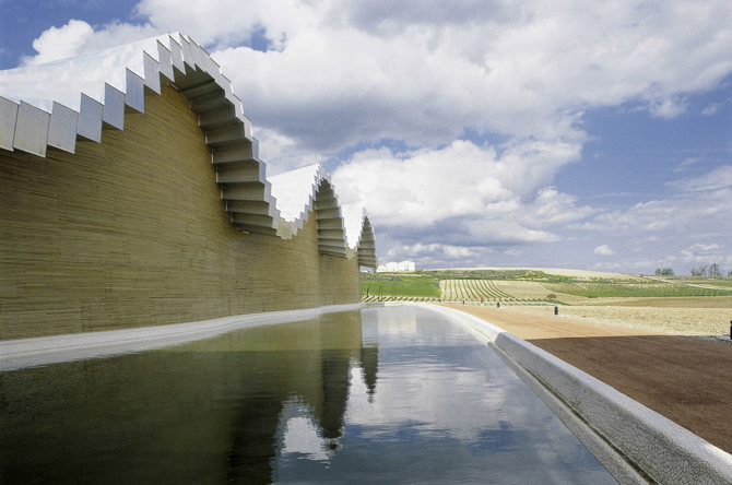 El terreno es irregular, con pronunciados cambios de rasante de hasta 10 m desde la cota más alta en el norte hasta la más baja en el sur, y aproximadamente la mitad del terreno está ocupado por viñedos. Calatrava adoptó la estrategia de dar un tratamiento volumétrico a la cubierta y a los muros –límites físicos del paisaje en el exterior y de la bodega en el interior– de manera que la continuidad entre ambos espacios se consigue mediante el “movimiento estático” de los cerramientos. Dos muros de carga de hormigón de 196 m de longitud, colocados a 26 m de distancia, trazan una forma sinusoidal tanto en planta como en alzado.