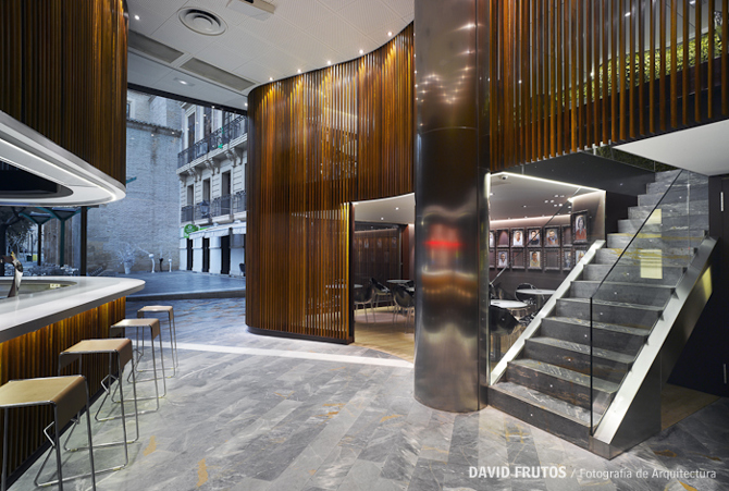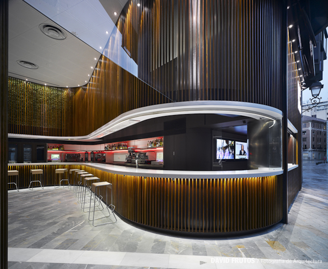 El nuevo Café del Arco captura un pedazo de la ciudad. Acorde con la renovación del local, se ha propuesto una iluminación renovada 100% LED. Foseados de luz que bañan los paramentos verticales, iluminación RGB que transforma el carácter del proyecto durante la noche, el propio letrero exterior se conforma con piezas de metacrilato retroiluminadas...