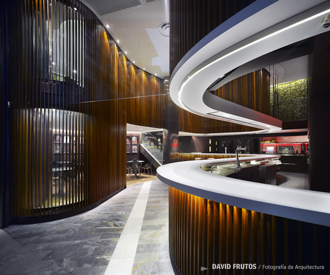 También el concepto de vitrina para tapas se renueva, convirtiéndose en un elemento móvil, que asciende y desciende automáticamente, permitiendo así liberar la barra durante el horario de copas, horario que queda ambientado con una iluminación de color cambiante.