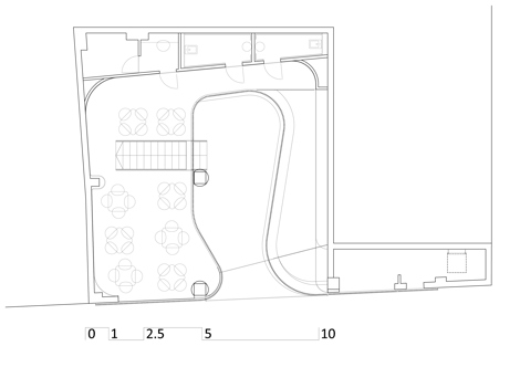 Para poder recrear un espacio continuo cafetería-terraza era necesario articular mecanismos arquitectónicos que permitiesen disolver el límite entre la edificación y espacio público. Desde el primer croquis aparece ese trazado sinuoso en forma de fondo de saco que pretende dar respuesta a este conjunto heterogéneo de requerimientos con economía de recursos proyectuales.