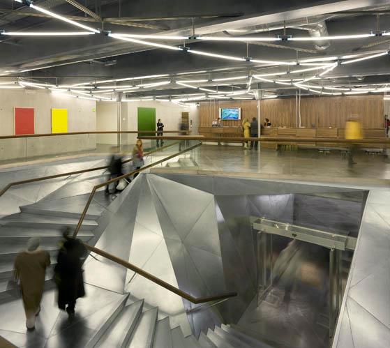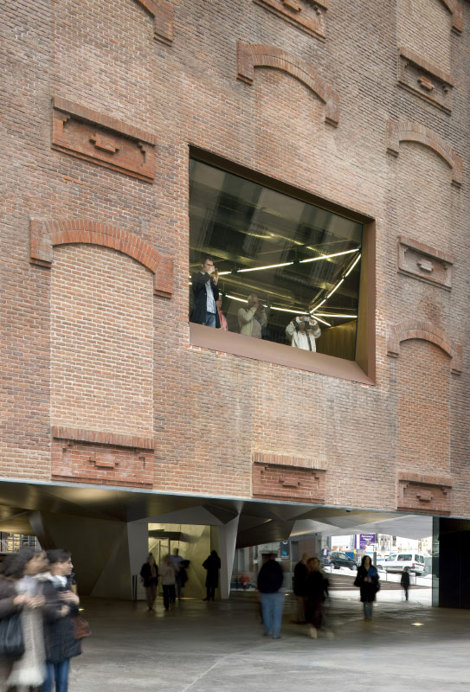 Para orquestar e insertar los nuevos componentes arquitectónicos del proyecto de CaixaForum, empezamos con una operación quirúrgica, separando y eliminando el zócalo y las partes de edificio que ya no iban a ser necesarias. Esta operación proporcionó una perspectiva enteramente nueva y espectacular de la vieja construcción, al tiempo que resolvió una serie de problemas relacionados con el emplazamiento. Al suprimir la base del edificio, apareció un espacio abierto y cubierto bajo la carcasa cerámica, que ahora parece flotar sobre el nivel de la calle.