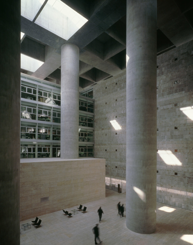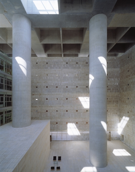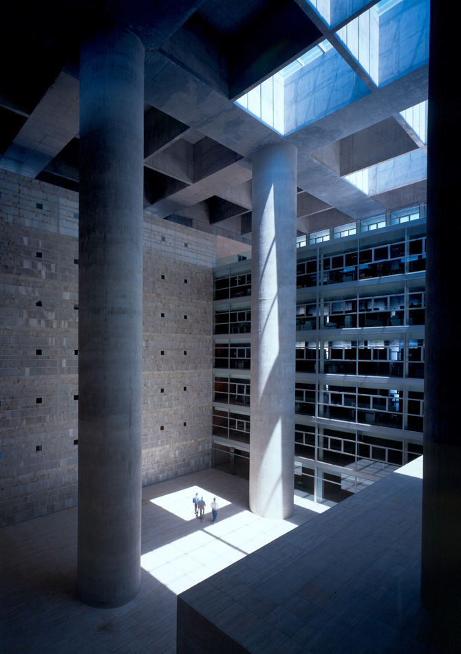 Se trata de una caja de hormigón y piedra que atrapa la luz del sol en su interior para servir a las funciones que se desarrollan dentro de ese “impluvium de luz”. En este podio se resuelven aparcamientos, archivos y el Centro de proceso de datos. En el cubo, alrededor del patio central, se organizan las oficinas en siete plantas.