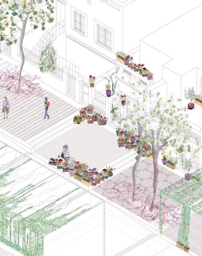 La propuesta opera esencialmente en la modificación de la topografía. Se mantiene el acceso rodado y se favorece el tránsito a través de una rampa, creando pequeñas zonas de descanso: una apropiación abierta del espacio público para actividades al aire libre. Estas plazoletas, que se escalonan a lo largo de la calle existente, subrayan el carácter doméstico que marca la historia del lugar. La vegetación será fundamental en los próximos años para lograr el confort térmico y lumínico y fomentar la vida al aire libre.