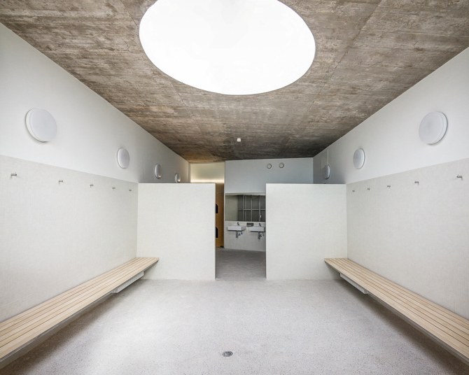 La distribución de usos en el interior se desarrolla en rampa, descendiendo a través del túnel de vestuarios hasta el nivel del campo.
