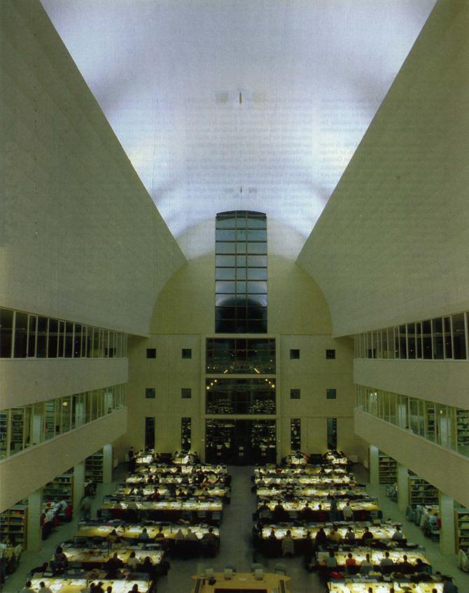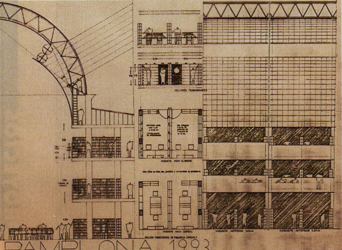 El arquitecto navarro quiso dotar a la nueva universidad de una imagen que la identificara con rotundidad. Para ello eligió la biblioteca como edificio emblemático. Con esta premisa creó un campus en tomo a este edificio, con inicio en el aulario y final en el rectorado. Estos tres edificios se enlazarían con un espacio verde, un paseo estudiantil que permitiera congregar la vida de todas las áreas docentes.