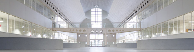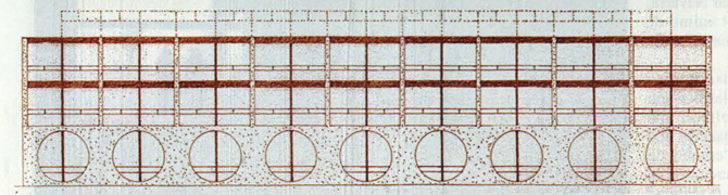 Un aspecto de este edificio que llama la atención es el tipo de soportes elegidos, más de cien columnas de sección circular y capitel troncocónico que se deslizan a lo largo de los pasillos.
