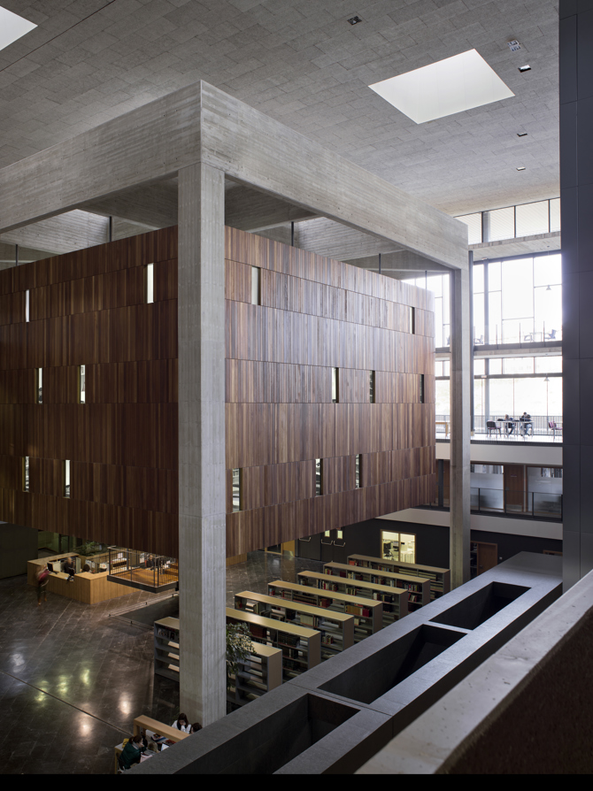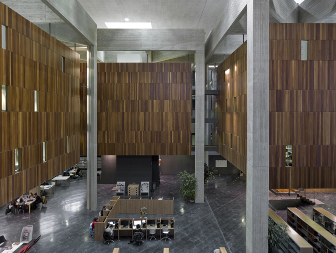 Esta consiste en la construcción de un amplio espacio público cubierto, extensión de la trama urbana, al servicio de la comunidad universitaria y al conjunto de los ciudadanos por ser lugar de encuentro, eventos y celebraciones. En él se sitúa la biblioteca, formada por tres cofres de madera colgados de sendos baldaquinos, cuya estructura permite la diafanidad del espacio. Se trata de un lugar lleno de vida y actividad que se recorre mediante escaleras y pasarelas. En contraste con este espacio, en un foso más recoleto situado en el centro de este y al que se llega mediante rampas, se produce el acceso a la biblioteca. Exteriormente el edificio se integra en la escala del tejido urbano mediante una fragmentación de los volúmenes que contrasta con la rotundidad de la escala del espacio interior. Se ha establecido una continuidad entre los materiales internos y externos del edificio, lo que permite dar al espacio interior un carácter de exterior cubierto.