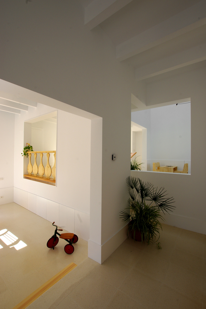 La reutilización de la piedra de marino entrelaza el presente y el pasado para mostrarnos su carácter intrínsecamente mallorquín, mientras nos agasaja con una piel de original textura agujereada por unas aperturas sutilmente ocultas y otras fuertemente reculadas, que, una vez en el interior de la casa nos obligan a descubrir pequeños volúmenes escondidos entre el grosor aparente de sus paredes de la fachada, lo cual confiere una armónica distribución donde penetra con fuerza la luz de la isla