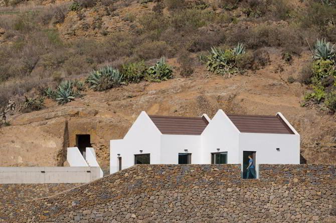 Las casas que son los ojos de las cuevas para mirar el paisaje. La Casa de las Cuevas en Artenara, de Gloci arquitectura (Jaime González y Jorge Castro), utiliza las cuevas prehispánicas preexistentes como intercambio térmico. Adosan, como contrapunto (desde una tecnología contemporánea con el sistema modular Steel Frame), unas pequeñas casas a dos aguas.