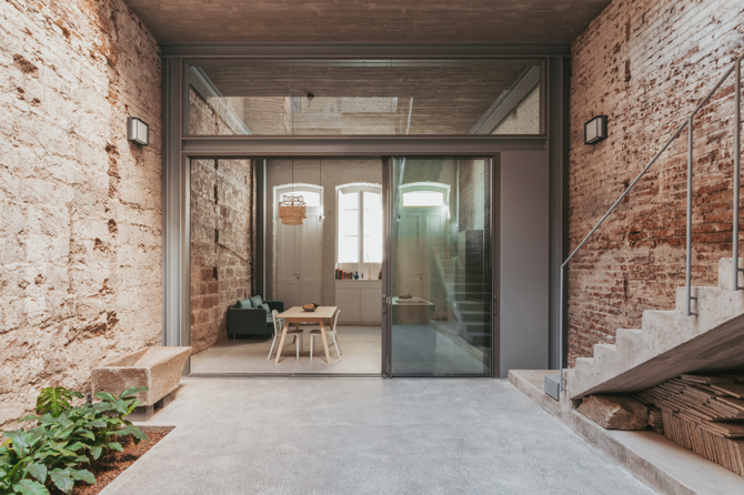 El vaciado interior del patio se convierte a su vez en el recorrido de escaleras. Una remonta de hormigón con textura volcánica se sobrepone en un segundo plano a la renovada fachada existente.