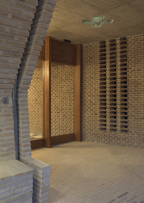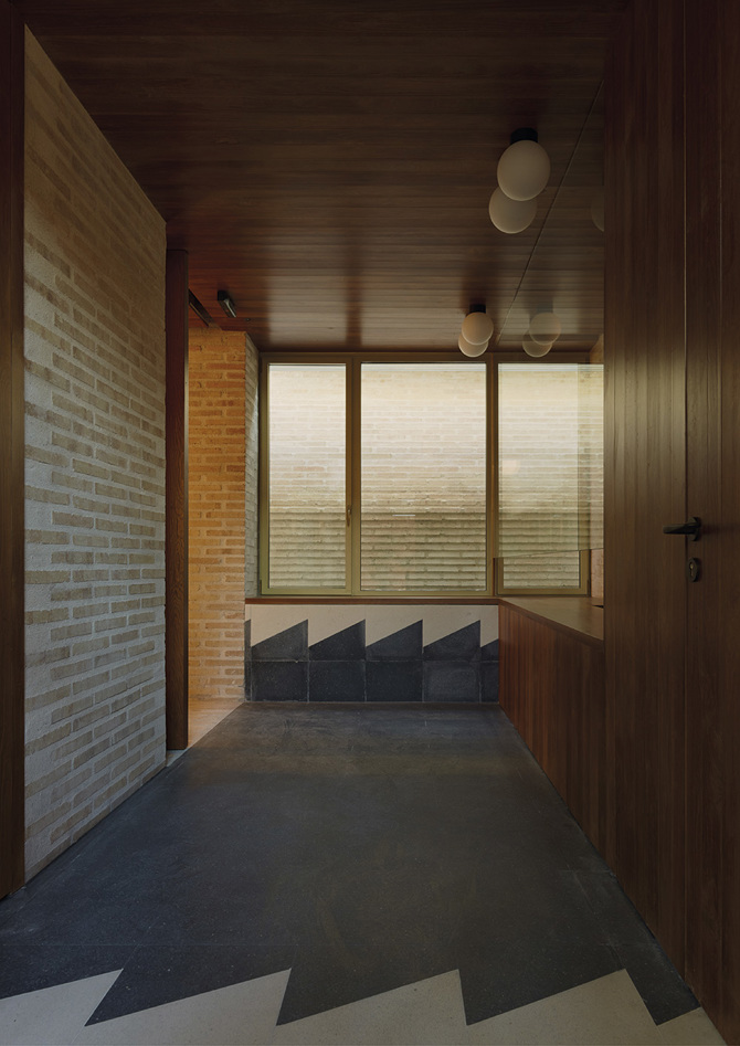 Los materiales utilizados son los tradicionales del lugar: el ladrillo cerámico, en las paredes y la vuelta; el hormigón, en su condición más austera; y la madera de pino, barnizada. Todo está construido por artesanos locales y con la clara voluntad de perdurar en el tiempo. Dentro, el material y grosor de las paredes logran una inercia térmica que, como siempre ha sucedido con la arquitectura tradicional, favorece un clima más templado. El edificio se protege del sol y ventila de forma natural al abrir las ventanas más altas a norte, refrescando y renovando así todo el aire interior.