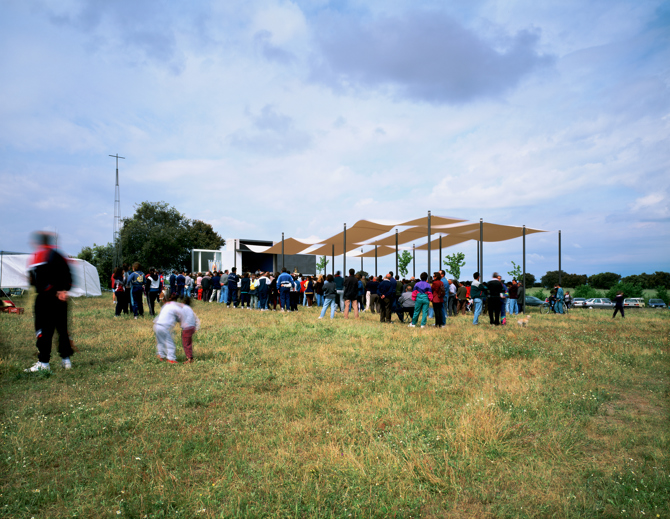 El ábside es el cuerpo de edificación permanente, construido con muro de carga y elementos de cantería. Al deslizar unos portones el espacio se extiende con alineaciones de pilares desmontables que sujetan techos de toldos de lona blanca