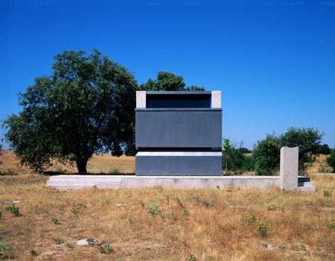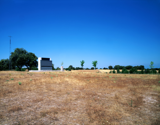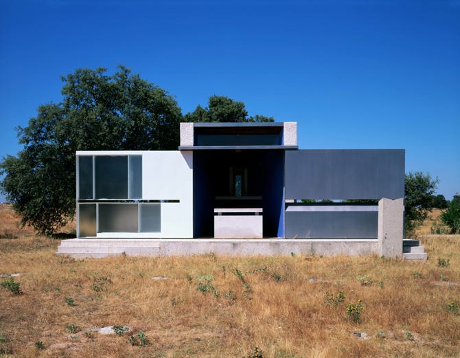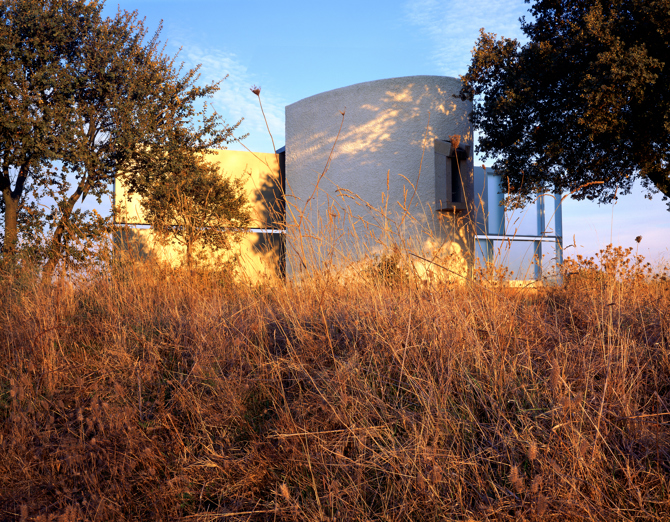 “Cuando la capilla está cerrada, se pierde en un paisaje donde la maquinaria y las pequeñas construcciones agrícolas son frecuentes. La segunda puerta vela el interior. El altar y la imagen solo se descubren durante la ceremonia religiosa. Con las puertas abiertas se ofrece como templo de culto católico: un altar, un retablo y una vidriera, con la línea del horizonte entre el cielo y la tierra como tema común”. (Pies de foto de las tres imágenes frontales del ábside)