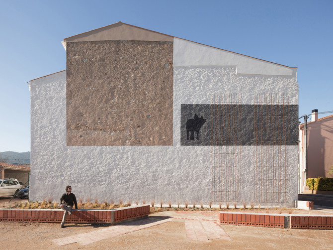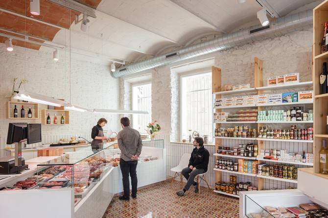 El requisito primordial es implacable: maximizar los metros lineales de exposición de productos. El mobiliario se convierte en el protagonista. Gestiona la entrada en un juego de miradas y descubrimientos, organiza en la diagonal más larga el espacio para guiar la compra de los clientes, expone la carne y los embutidos y nos dirige la mirada hacia los productos más suculentos. El blanco nuclear resbala por las ventanas del escaparate hasta la fachada de la carretera de Celrà y envuelve todo el edificio de modo que nunca volverá a pasar desapercibido por ningún conductor estresado. Una franja oscura gira y se entrelaza a la medianera confiriéndole un estatus de fachada principal; se convierte así en el mural de la zona de aparcamiento para los clientes que llegan entre gramíneas a buscar sus víveres.
