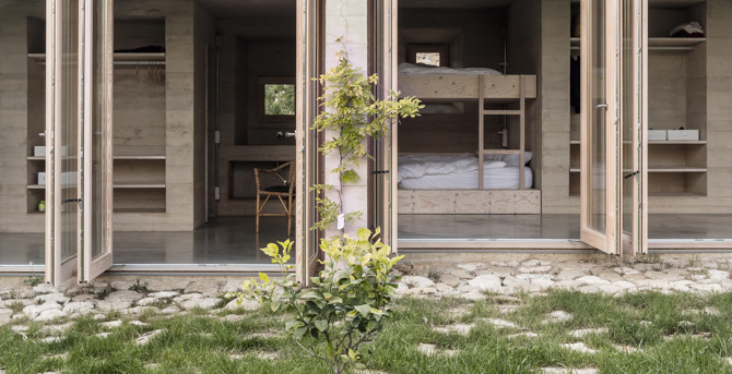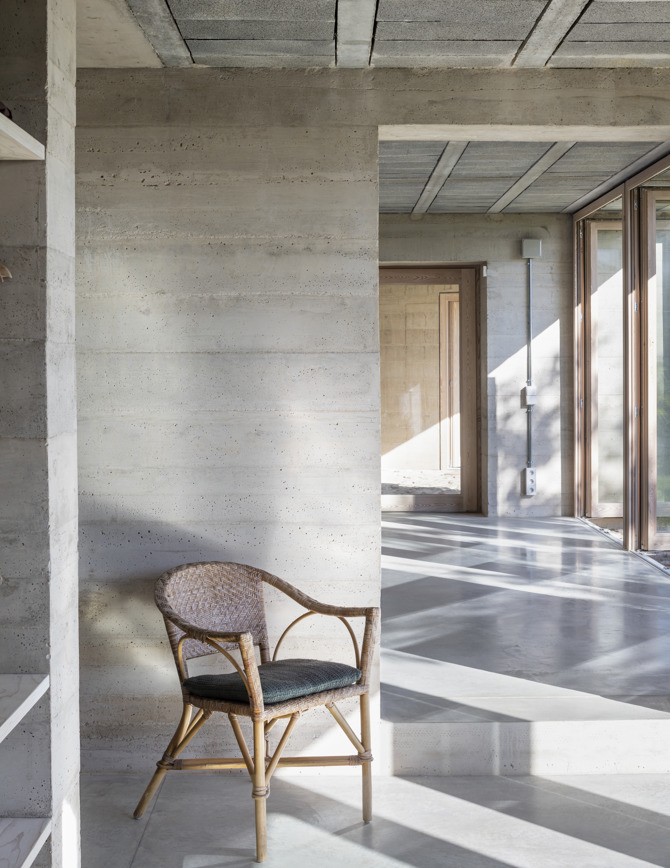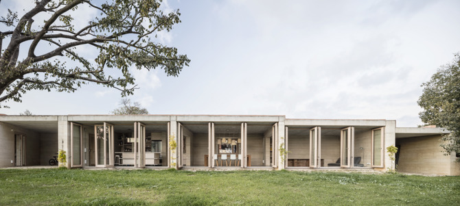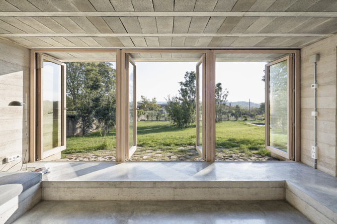 Se produce una secuencia entre los espacios más domésticos y los ámbitos más exteriores y salvajes. Las relaciones longitudinales se solucionan por delante del programa más estático, que queda adosado al muro, creando una larga secuencia de galerías que permitan sacar provecho de las ganancias solares durante el periodo de invierno. Cuando hace buen tiempo, las galerías se pueden abrir totalmente convirtiéndose en un gran porche abierto al jardín. Una transición entre los diferentes climas del edificio que evoluciona constantemente a lo largo del año.