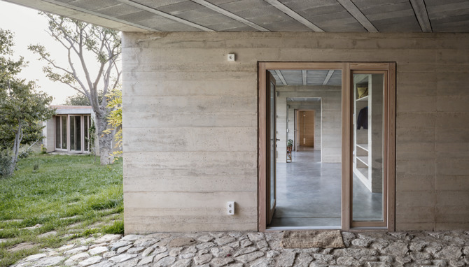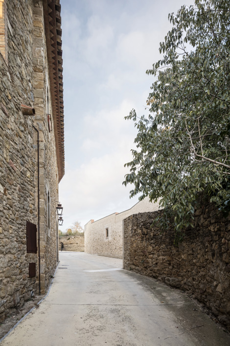 Se construirá integralmente con muros de carga, reutilizando piedras del muro existente mezclándolas con áridos propios del solar junto con dosificaciones de cal y cemento. En esta base de mortero tradicional se añadirán pequeñas partículas aislantes de vidrio reciclado insuflado. En vez de apilar, el muro se encofrará y se irá subiendo con una técnica mixta entre el tapial y el muro ciclópico. Las capas exteriores que dan a la calle se repicarán hasta hacer aflojar la piedra, mientras que las caras interiores se dejarán con el acabado propio del muro encofrado.