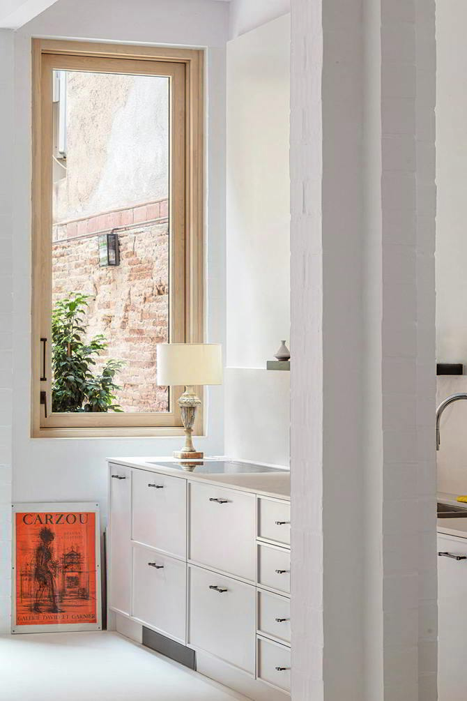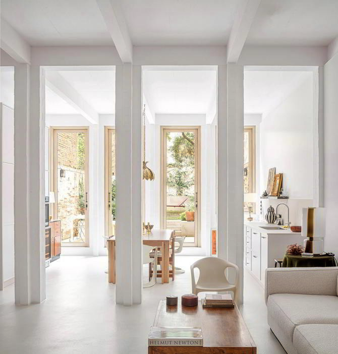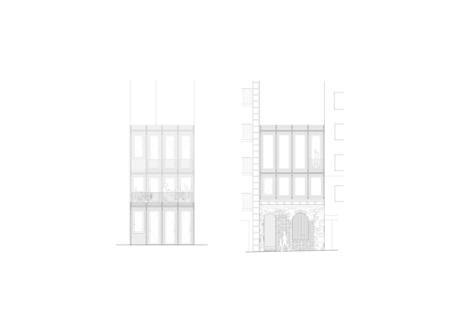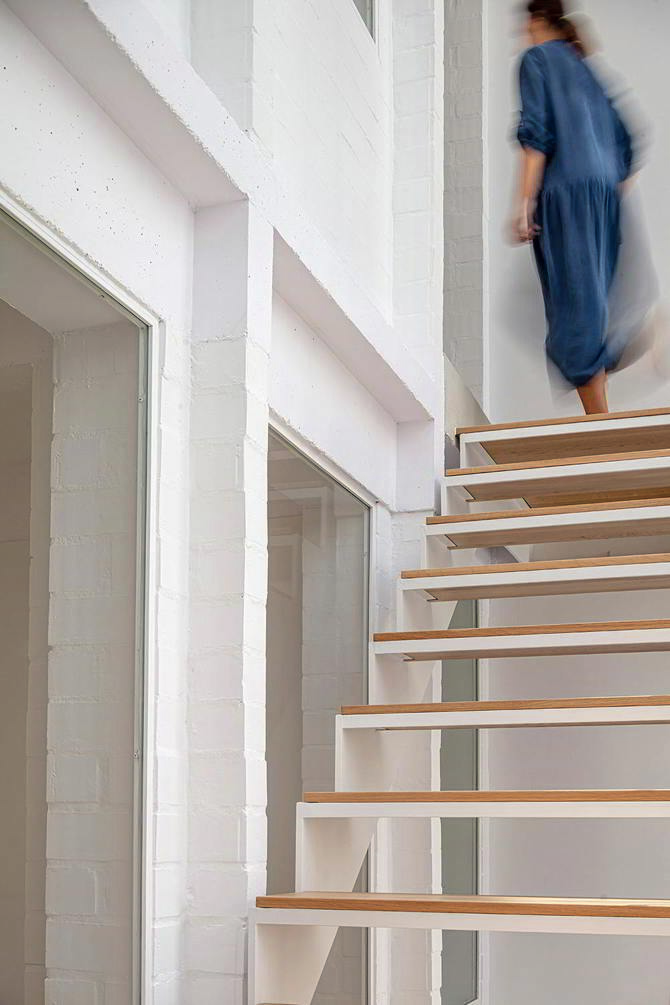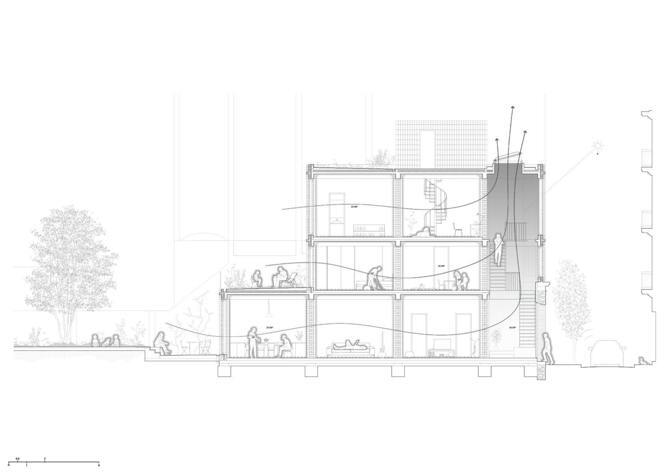La propuesta se define en dos decisiones básicas, por un lado, promover la privacidad en sección asignando a cada uno de los tres niveles un perfil de usuario, y por otro lado, la casa se relaciona con el exterior a través del jardín, situando en la fachada de la calle el gran espacio de la escalera. Ambas decisiones permiten que las plantas sean prácticamente diáfanas y que el espacio de escalera pueda funcionar como un patio favoreciendo la ventilación natural y limitando el ruido o molestias de la calle.