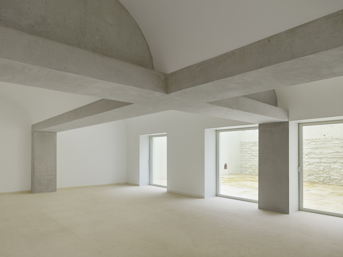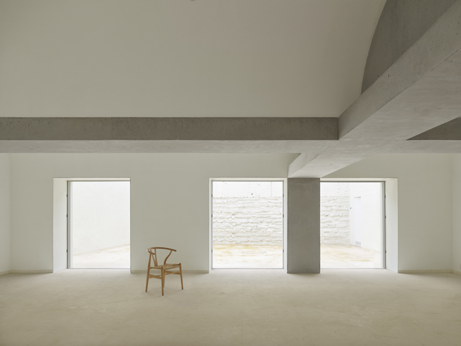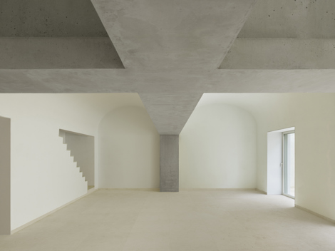 El proyecto plantea la inversión de este orden estructural por requerimientos funcionales, dando lugar a un nuevo esquema espacial y programático. Dos vigas en “T” se cruzan en el espacio, dando lugar a una cruz de brazos asimétricos que libera el espacio completamente de apoyos intermedios, creando una planta diáfana. La combinación de arcos de fábrica de ladrillo con vigas de hormigón genera un entramado espacial de vigas y bóvedas sucesivas que cubren un espacio cargado de complejidad.