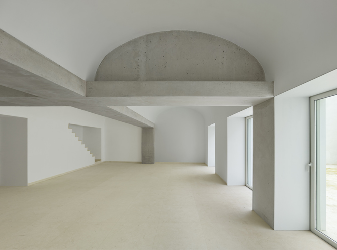 El proyecto mantiene, por lógica funcional, la división de las dos primeras habitaciones –garaje y cuarto de invitados– hacia la calle Carrera, mientras que el salón se convierte en un espacio diáfano abierto horizontalmente al jardín trasero y protegido verticalmente por la cruz estructural y dos bóvedas de cañón. Mientras que la planta crea un espacio continuo, estos techos abovedados crean distintos recintos virtuales en el mismo.