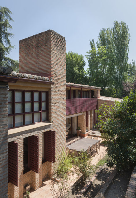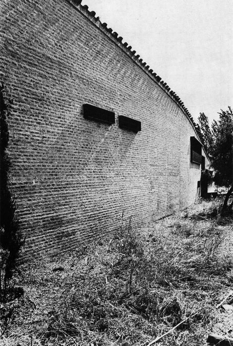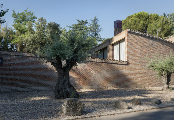 La forma del solar le sugiere la aceptación de la linde curva con la calle como muro de la casa, de modo que éste se unifica con la que, en otro caso, hubiera sido tapia, caracterizándose la imagen que la construcción ofrece con este único y potente gesto. En el interior, el pabellón de servicios cierra un patio-jardín con respecto al principal, defendiendo a éste de los ruidos de la autopista cercana y haciendo que el jardín gane también la cubierta del bloque de servicios ofreciendo un frente verde al exterior privado de la casa.
