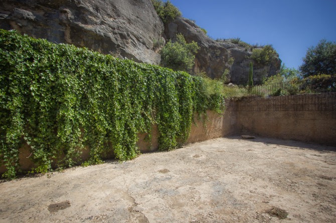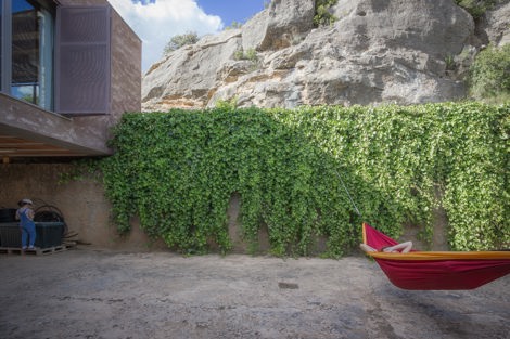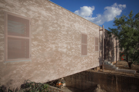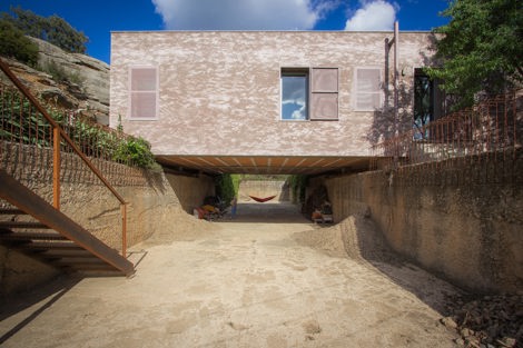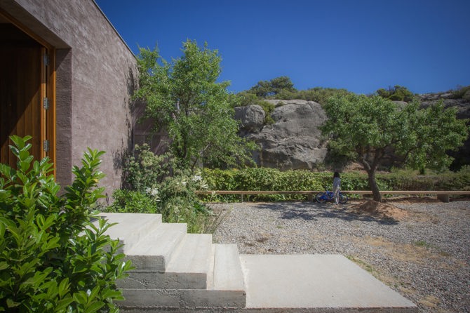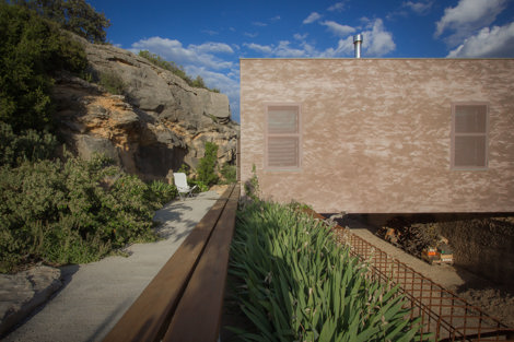 En el exterior, un revestimiento de yeso con pigmentos terrosos permite lograr una textura de apariencia mineral. La casa intenta convertirse en un nuevo elemento natural en la cisterna y al lado de la formación rocosa.