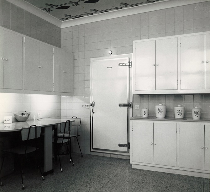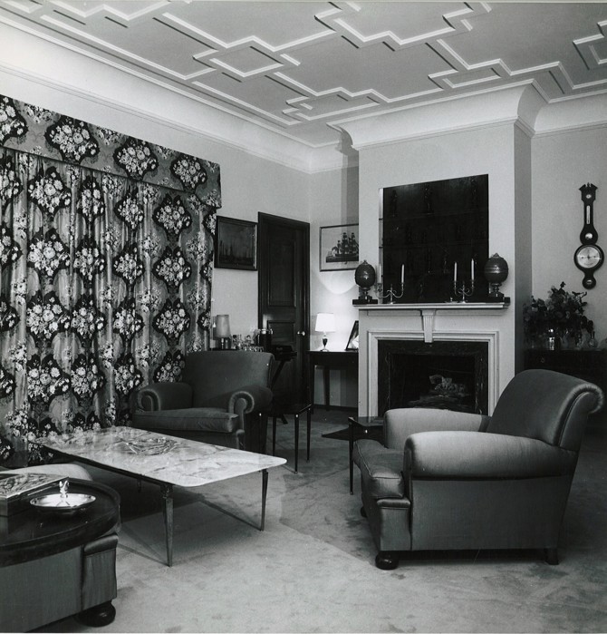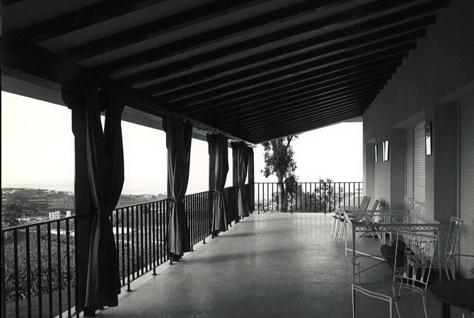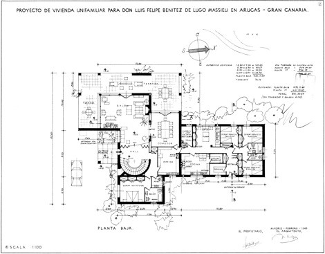 “Se dispone la entrada principal lateralmente, formándose alrededor de ella un patio con jardinería, dando acceso al hall del que arranca la escalera de comunicación con la planta 1, y al salón, pieza a la que se le concede la máxima importancia arquitectónica y decorativa, con una serie de terrazas cubiertas y medio cubiertas que harán el tránsito al exterior. Desde este salón se pasa al comedor, al cual se sirve a través del office, pieza que enlaza la zona principal con la de servicio, y verticalmente con otro office en planta 1 por mediación de un montaplatos. Además, existe en esta planta un departamento para invitados y un cuarto de aseo”.