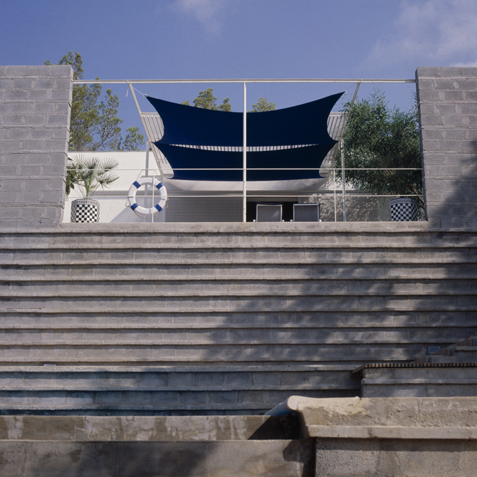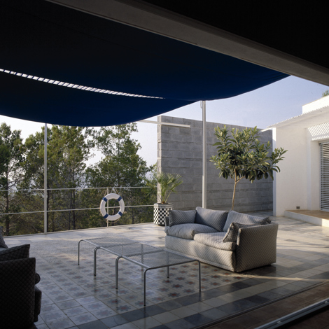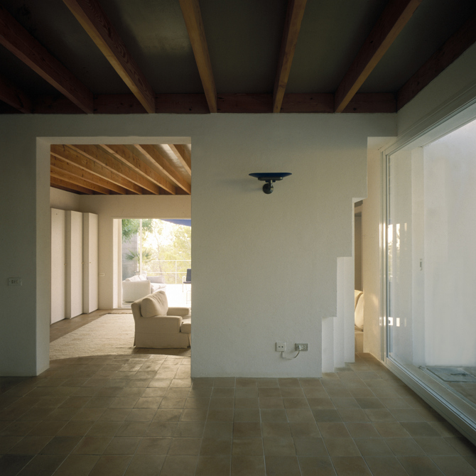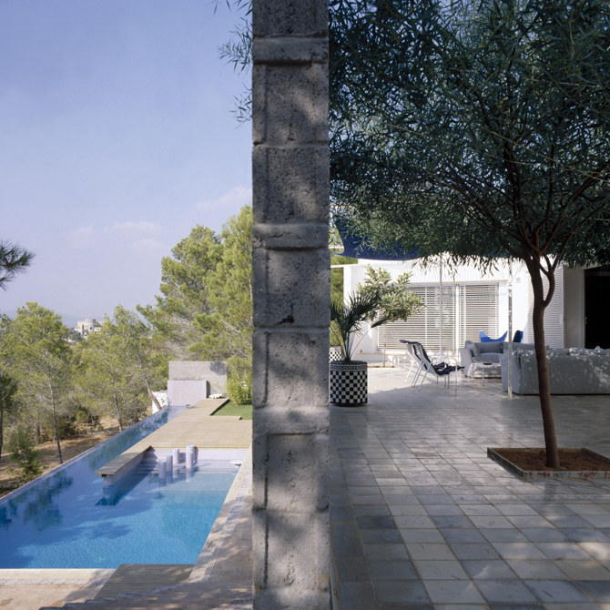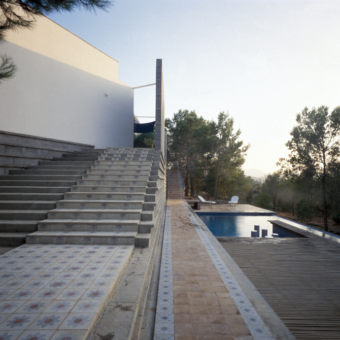 La casa emerge de lo existente sin dejar de ser nueva. Recuerdos lejanos de las casas rurales ibicencas. Las estancias interiores de la casa fluyen e intercambian entre muros blancos. Los espacios exteriores se prolongan y mezclan con los muros de piedra que soportan las antiguas terrazas de cultivo, ahora ocupadas por pinos de generación espontánea. Las vigas de madera, de igual sección, se distancian según la luz que deben cubrir; el pavimento interior, de arcilla cocida lustrada; entre suelo y techo los muros blancos son los protagonistas. Los pavimentos exteriores son alfombras de mosaicos hidráulicos reciclados. El salón interior se extiende en una terraza con veranda desde la que se divisa a lo lejos el mar; el agua dulce de la piscina, de algún modo, aproxima la salada. Una cubierta ligera para protegerse del nocturno rocío veraniego se acompaña con dos mimosas y un níspero. La piscina, entre muelle de club náutico y aljibe mexicano barraganiano, tiene un rincón de estar mojado, con pilones para apoyar copas de cocktail y mesita bandeja.