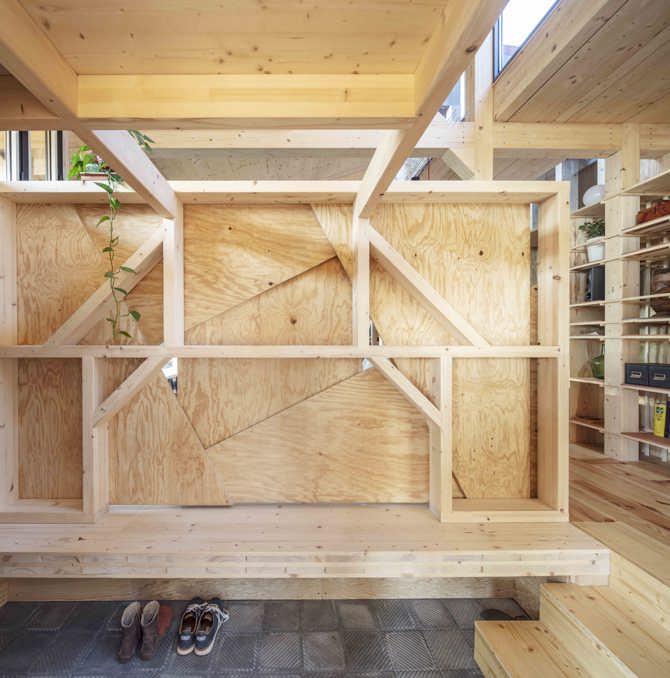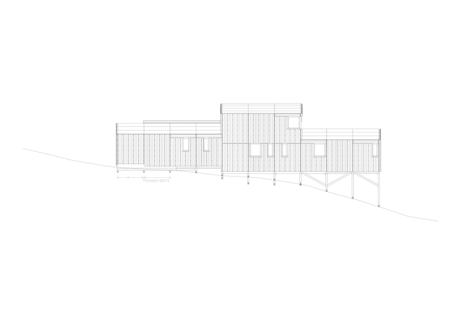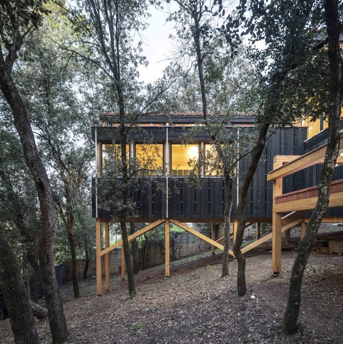 La casa reparte su peso en 43 pilares de madera laminada de 14 x 14cm que se apoyan sobre pilotes metálicos pinchados al terreno quirúrgicamente sin movimiento de tierras. Estos pilares seguirán subiendo por el interior, ramificándose en vigas y tornapuntas y reproduciendo en el interior espacios y anchos similares a las del bosque de fuera. Estructura dispuesta en franjas diáfanas de este a oeste, así nos permite obtener vistas pasantes de extremo a extremo de la parcela. Situada lateralmente, la casa no se percibe como un obstáculo y no partirá la parcela en mitades.
