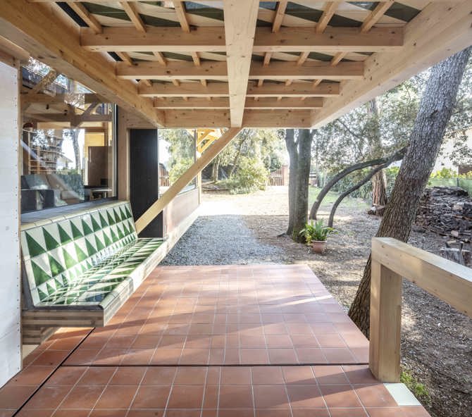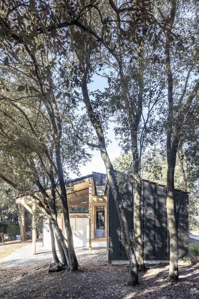 Nos interesa la posibilidad de transformar el interior en el exterior, como encapsular un pedazo de este bosque donde estamos, climatizarlo, amueblarlo, y que este sea el hábitat de la casa. En este encinar tenemos una luz difusa, filtrada, suave y muy agradable y esta misma luz la queremos también para el interior, mucha claridad pero no luz directa, así hay aberturas altas que miran a norte, y aberturas a sur que están bajo aleros. Se ve el canto de los paneles y del CLT, las cabezas de las vigas, tornillos y herrajes, rastreles del tejado y rastrillos de la fachada ventilada, el canto de la teja plana, de la cerámica y de los losetas de hormigón, la tela impermeable, cableado eléctrico, tubos de alcantarillado colgados... La casa como acoplamiento de elementos constructivos, y estos como definidores de su presencia, evitamos una imagen preconcebida o la contundencia de una idea.