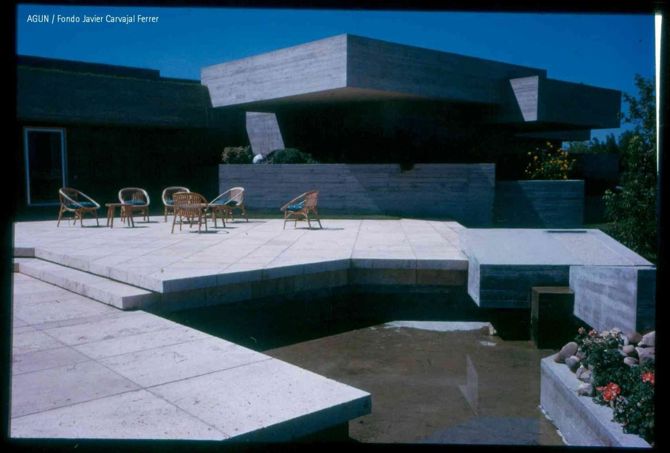 Ambas zonas –la de servicio y la noble– se comunican por un vestíbulo conectado con el salón a la altura del acceso principal, que se realiza por la fachada norte a través de un patio de coches. Los muros de cerramiento son de hormigón visto, que resalta la rotunda plasticidad de los volúmenes estrictamente ortogonales. Los frentes de las cubiertas, que avanzan poderosos desde las fachadas, son también de hormigón visto y su desarrollo acentúa la horizontalidad dominante del conjunto. Localizadas sobre las plataformas, se proyectaron en la Casa Carvajal zonas ajardinadas de gran interés, que se acercan a una síntesis con un lenguaje moderno de la jardinería hispanomusulmana. Cabe, por último, señalar que la original presencia plástica de estos edificios supuso su elección para el rodaje de la película La Madriguera, de Carlos Saura, en 1969.