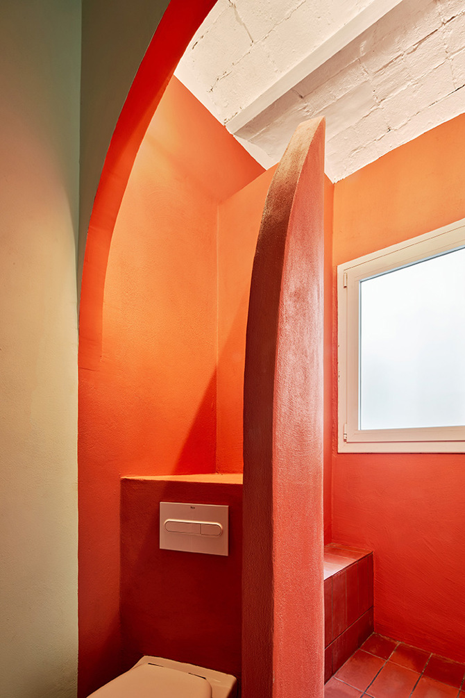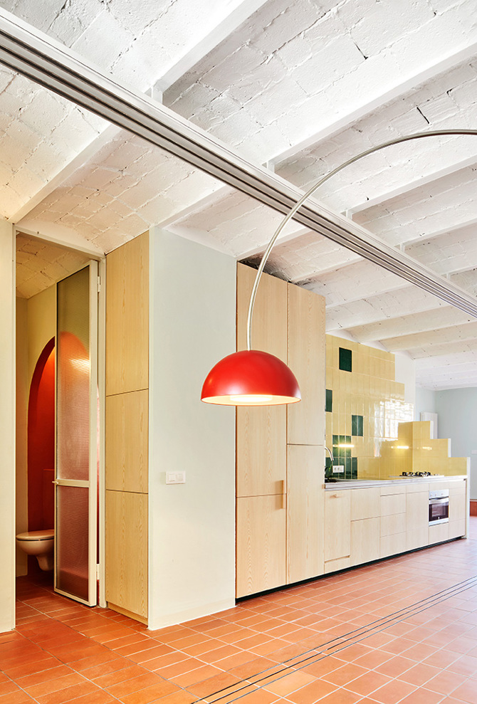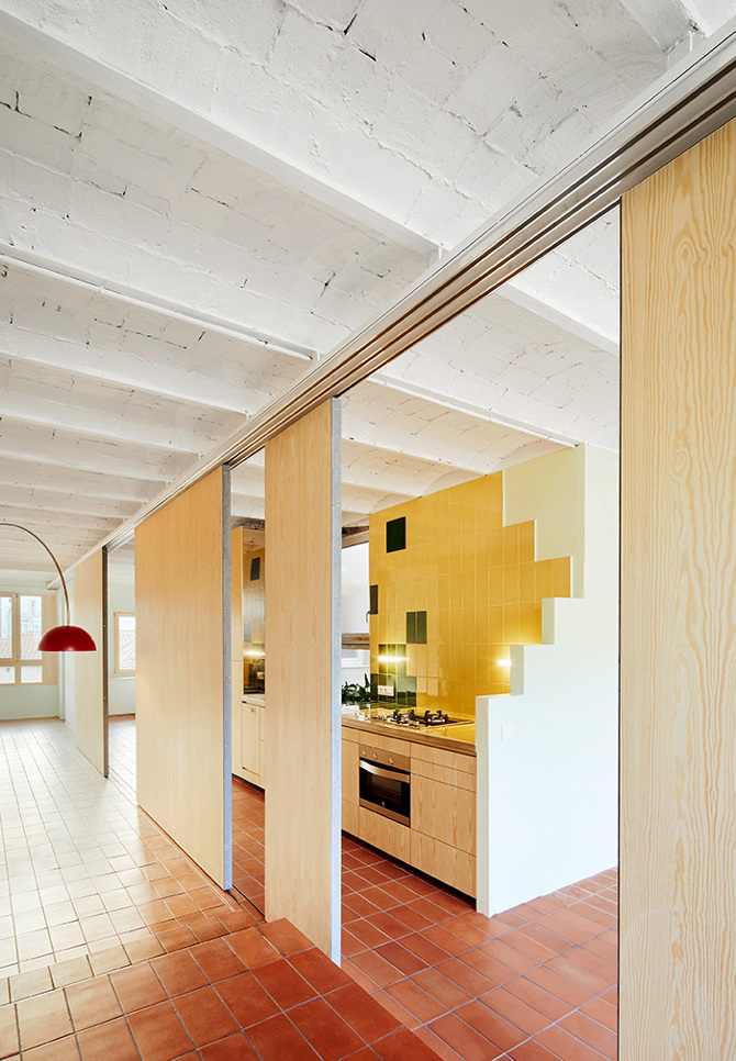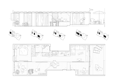 Vivir en una terraza. El proyecto se concibe según el principal deseo del cliente: una casa volcada hacia el exterior. La operación, sin embargo, no consistirá tanto en abrir las vistas hacia la terraza como en dotar el interior de atributos propios del exterior, resonancias del paisaje de las azoteas de la ciudad, a menudo invadido por la ropa colgada al sol. La orientación este-oeste del apartamento sugiere no recurrir a una distribución ortodoxa con zonas de noche y día asociadas a cada una de las dos fachadas.