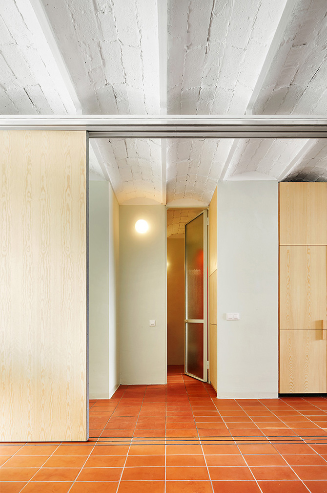 En su lugar, el programa se articula a través de dos habitaciones “segregables” situadas en lados opuestos de la casa y, más allá de la idea de “ala de estar”, una cadena de espacios comunes de similar magnitud que se extiende desde la fachada de la calle hasta el patio interior. En contra de la unicidad espacial del loft, la casa se “divide” por su eje longitudinal en una zona de vocación pública, en contacto con la entrada, y otra de inclinación más privada, junto al patio de luces, donde se acumulan los espacios técnicos de la casa y los dedicados al almacenaje.
