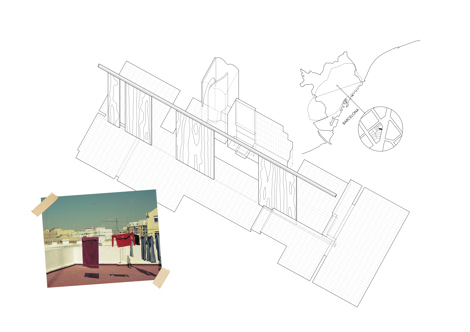 La materialidad del proyecto es sencilla, definiendo los dos principales elementos que lo componen. Madera para lo tectónico –como definición de los elementos móviles– y rasilla cerámica, habitual en la mayoría de las azoteas de la ciudad, para lo estereotómico –como definición de lo estático–.
