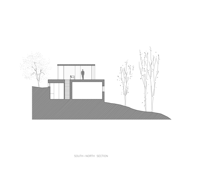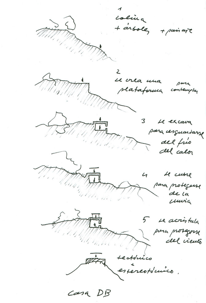 Abajo, la cueva como espacio para el refugio. Arriba la cabaña, la urna, como espacio para la contemplación de la naturaleza. La composición de los soportes, con una doble simetría, colabora a dar un carácter estático, sereno a la casa. Quiere esta casa ser una traducción literal de la idea de la caja tectónica sobre la caja estereotómica. Como una destilación de lo más esencial de la arquitectura. Una vez más el más con menos.